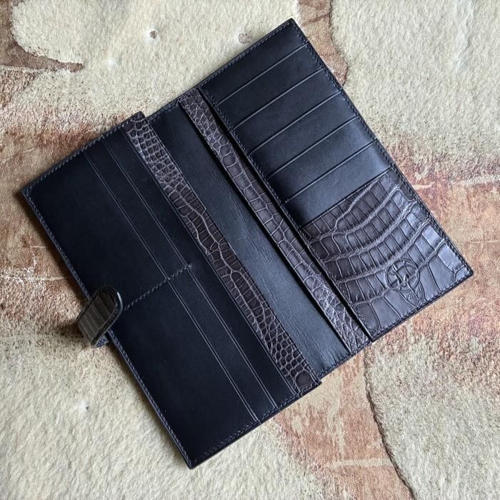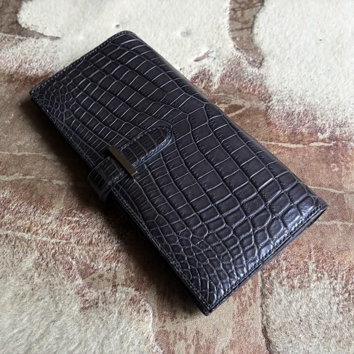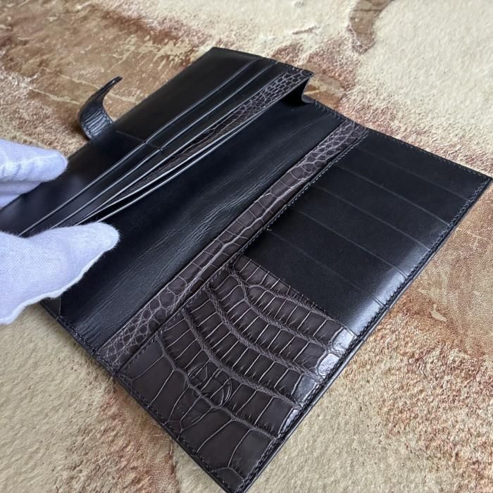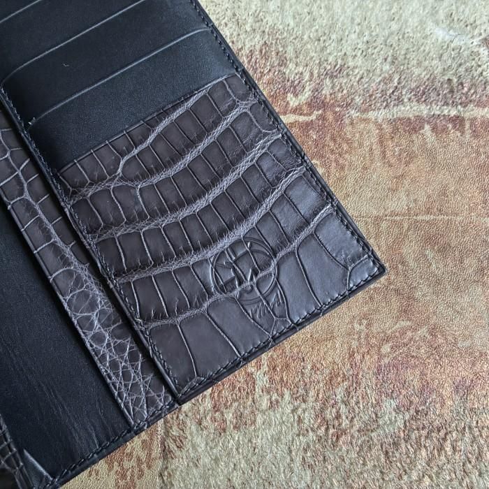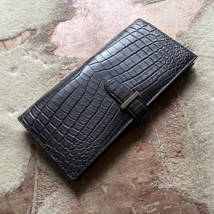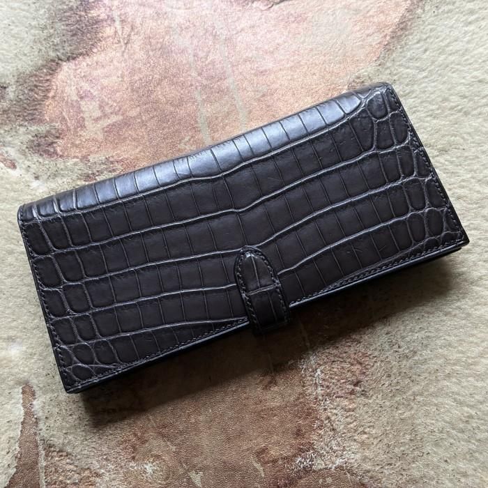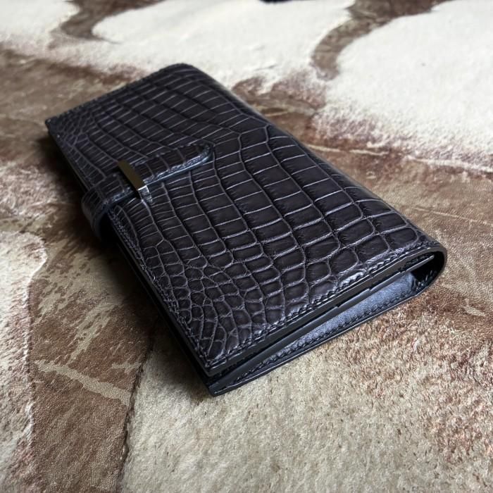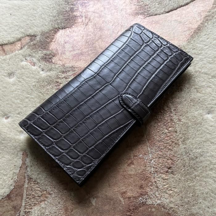 シックなグレーのナイルクロコダイルを使用した二つ折り長財布が完成しました。