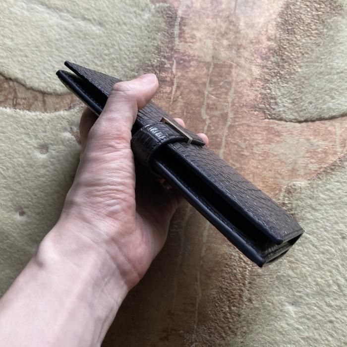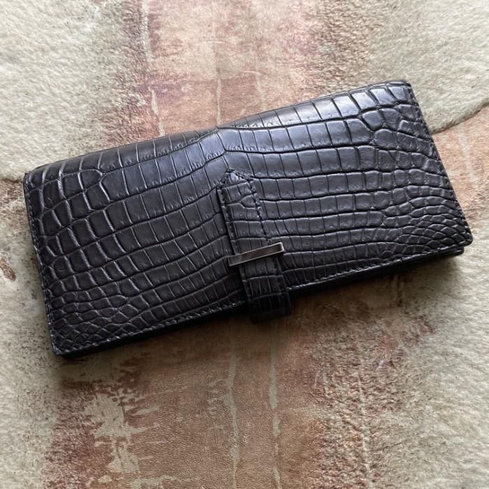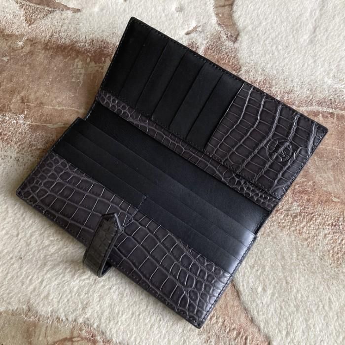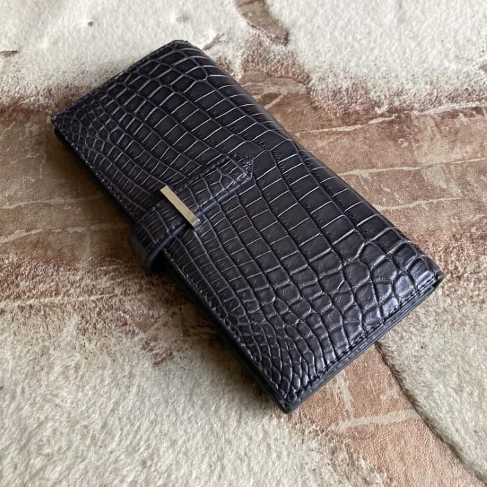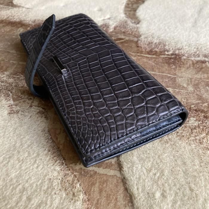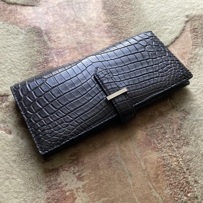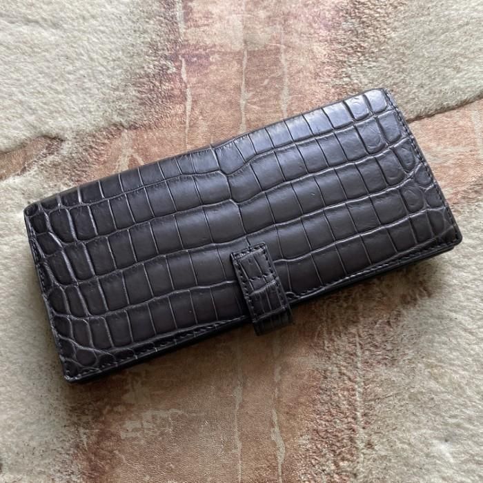 シックなグレーのナイルクロコダイルを使用した二つ折り長財布が完成しました。