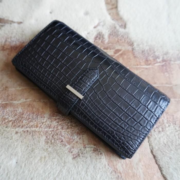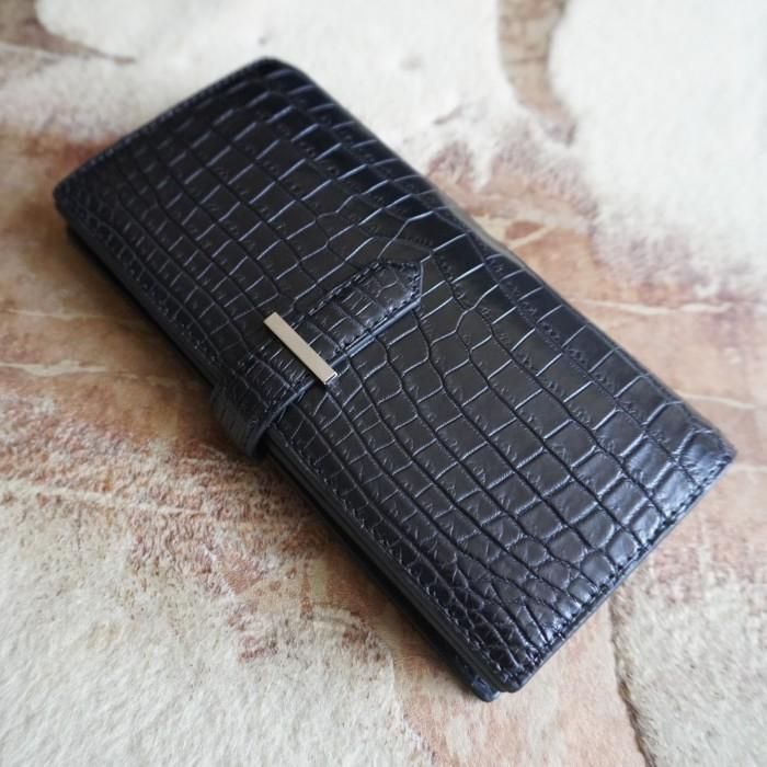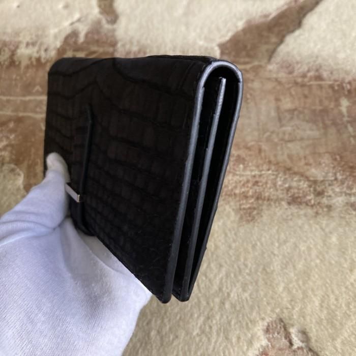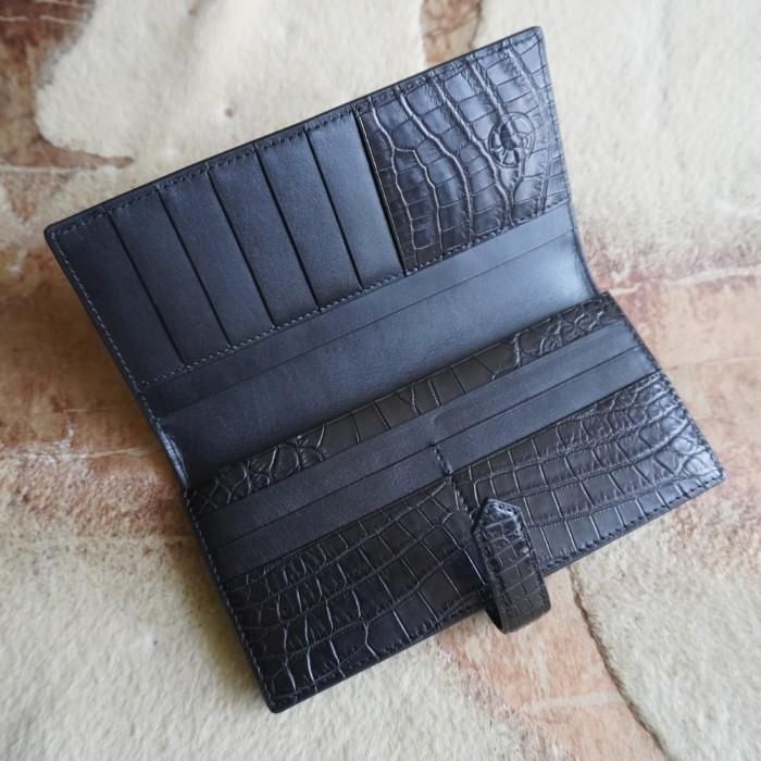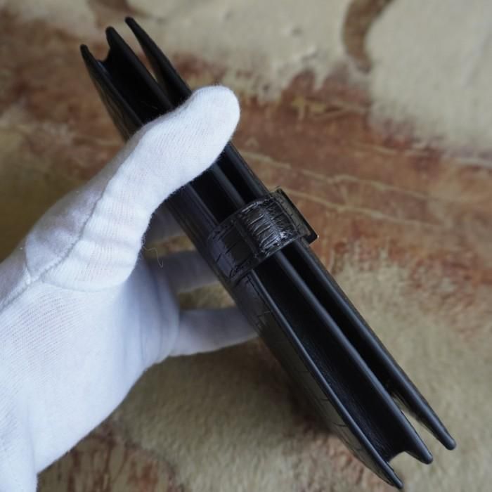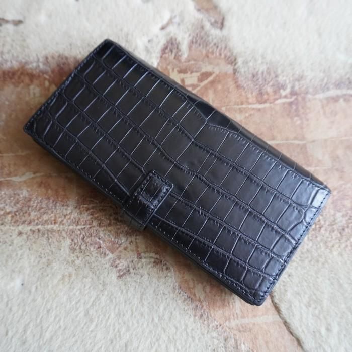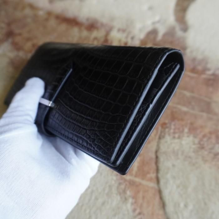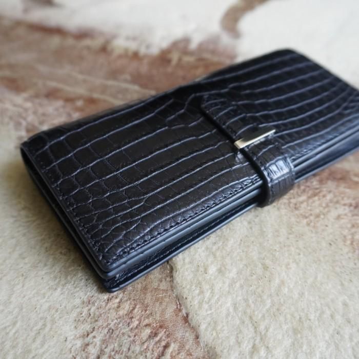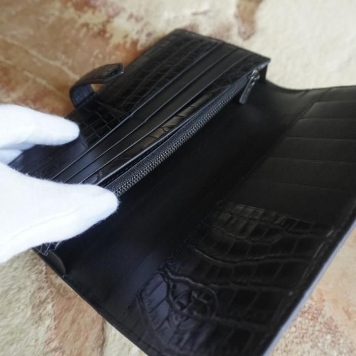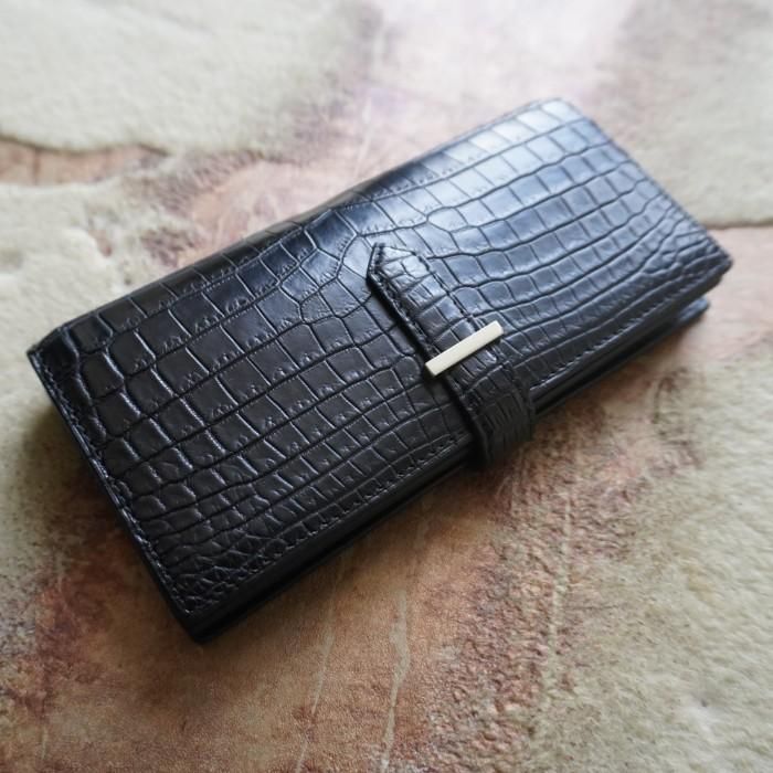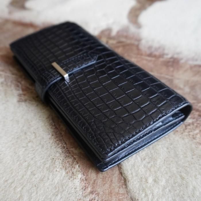 程よい光沢感があるナイルクロコダイルのブラックを使用した100万円がピッタリ入る二つ折り長財布が完成しました。